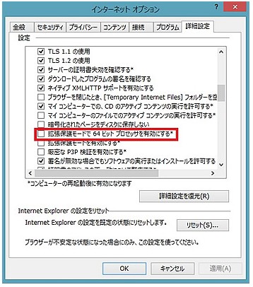 「メニューバー」>「ツール」>「インターネットオプション」>「詳細設定」タブ>「拡張保護モードで64ビットプロセッサを有効にする」のチェックを外すことにより、32ビット版で起動します。
