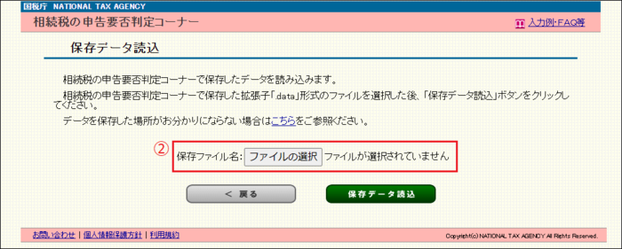 ① 相続税の申告要否判定コーナーのトップ画面の「保存データを利用して判定を再開する」ボタンをクリックします。