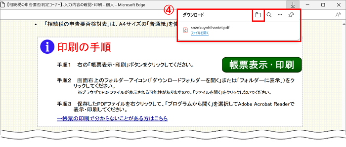 初期設定から変更がない場合は、ダウンロードフォルダにデータが保存され、④の画面が表示されます。