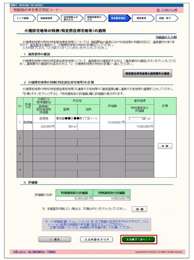 なお、「小規模宅地等の特例(特定居住用宅地等)の適用」画面での入力が終了し、「入力終了(次へ)>」ボタンをクリ