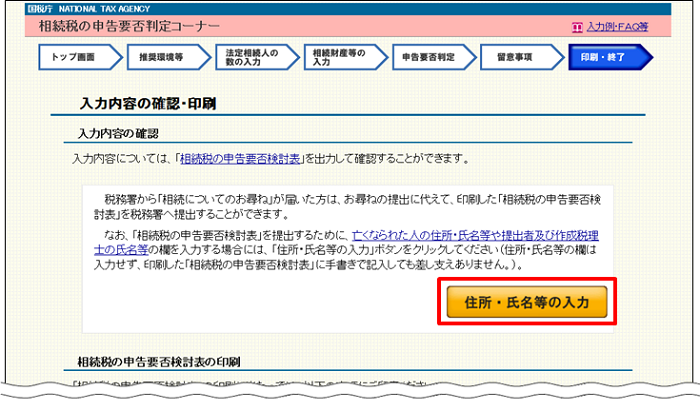 ① 「入力内容の確認・印刷」画面の「住所・氏名等の入力」ボタンをクリックします。