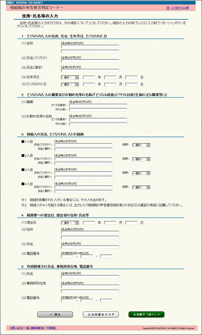 平成29年4月21日に、「住所・氏名等の入力」画面を追加し、「相続税の申告要否検討表」の亡くなられた人の住所・氏名等や提出者及び作成税理士の氏名等の欄を入力することができるようになりました。