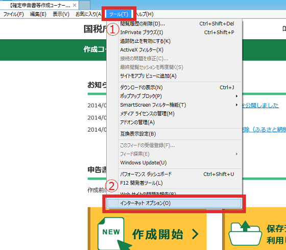 - ②「インターネットオプション」をクリックしてください。