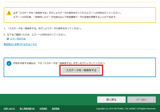 画面下の「入力データの一時保存」ボタンをクリックし、申告書データの保存を行ってください。