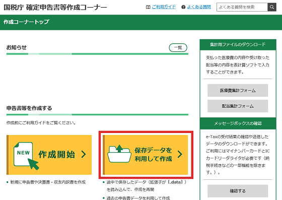 ① 申告書作成画面下の「入力データを保存する」ボタンからデータの保存を行ってください。データの保存を行わずにブラウザを閉じると、入力した内容が失われますので、ご注意ください。
