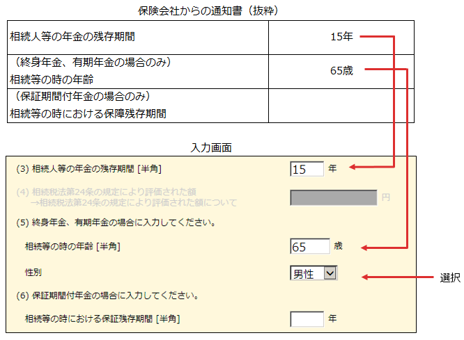 有期年金の場合、[(3)相続人等の年金の残存期間]、[(5)終身年金、有期年金の場合に入力してください。]の[相続等の時の年齢]及び[性別]を入力します。