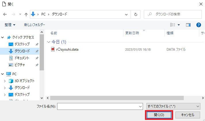 3 「ファイルの選択」ダイアログボックスが表示されますので、読み込むファイルを指定し、「開く」をクリックします。