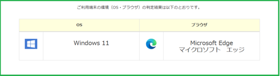 環境確認シート(外部サイト)」にアクセスしていただくと、次のように、ご利用端末の環境(OS・ブラウザ)が自動で判定されます。