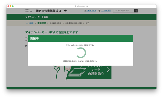 Macintoshの令和3年2月1日にリリースされたSafari14.0.3でe-Tax(マイナンバーカード方式)をご利用の場合、マイナンバーカードの利用者証明用電子証明書のパスワード(数字4桁)を入力するときに画面をロックすると、次の「認証中」画面で以下の状態のまま先に進めない事象が発生することがあります。