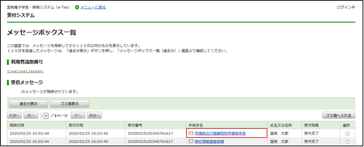「メッセージボックス一覧」から確認するものを探し、手続名をクリックします。