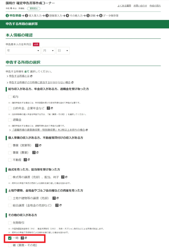「収入・所得の入力」画面の「一時所得」から入力してください。