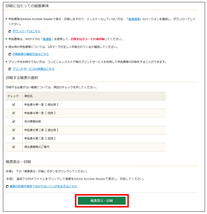 ① 「帳票表示・印刷」ボタンをクリックします。