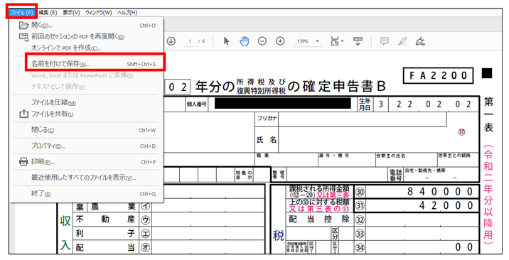⑤ PDFを保存する場合は、左上の「ファイル」をクリックを選択し、表示された一覧から「名前を付けて保存」をクリックし、任意のフォルダを選択して保存します。