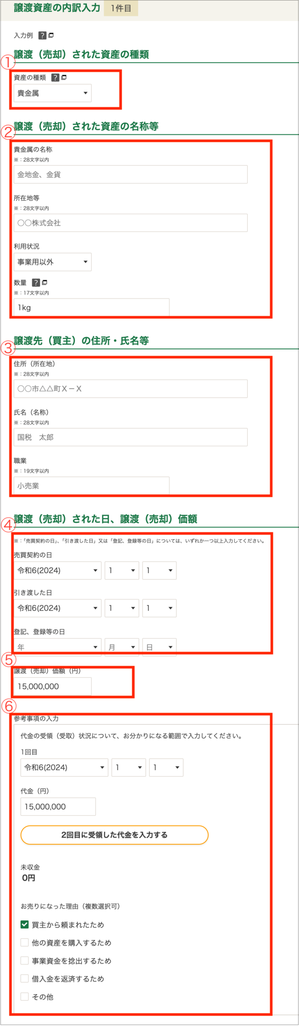 ⑥ 売却理由に当てはまるものにチェックし、譲渡(売却)した資産の譲渡(売却)代金の受領状況を入力します。