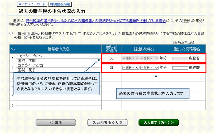 ただし、過去の年分において同じ贈与者からの贈与について「特例税率」の適用を受けるために当該書類を提出している場合には、申告書第一表の「過去の贈与税の申告状況」欄に、その提出した年分及び税務署名を記入し、当該書類を重ねて提出する必要はありません。