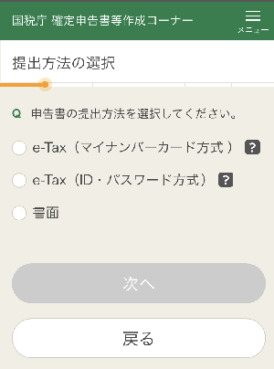 「e-Tax(ID・パスワード方式)」を選択して、「次へ」をタップしてください。