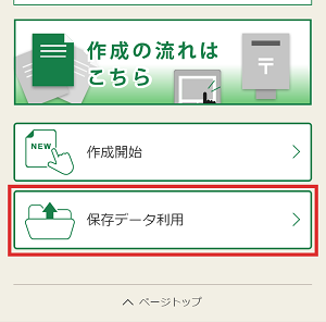 作成コーナートップ画面を開き、「保存データ利用」をタップしてください。