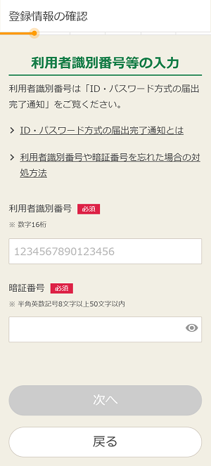 申告される方ご本人の利用者識別番号と暗証番号を入力して、「次へ」をクリックしてください。