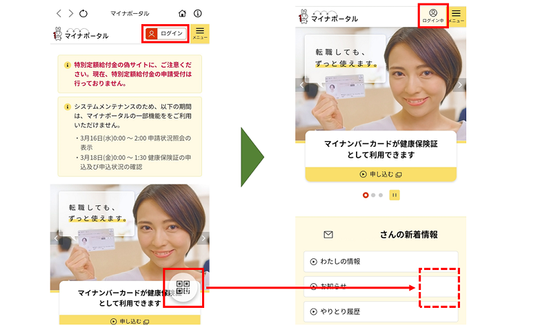 アプリ画面の右上にある「ログイン」ボタンをタップしてマイナポータルにログインすると、2次元バーコードアイコンが表示されなくなりますので、インストール後はスマートフォンを操作しないようご注意ください。