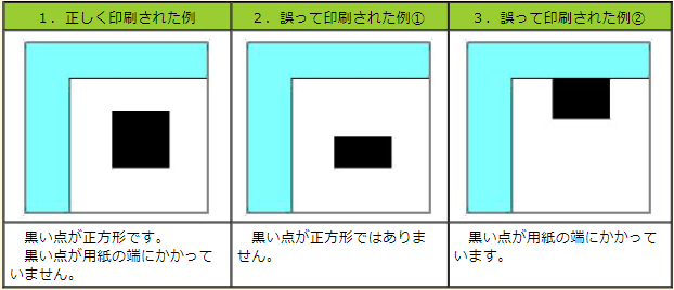 申告書の隅3か所に印刷された黒い四角形(3点マーク)の形状で、正しく印刷されているかを確認してください。 確認方法は、3点マークのすべてが①正方形で、②用紙の端にかかっていないかを確認してください。