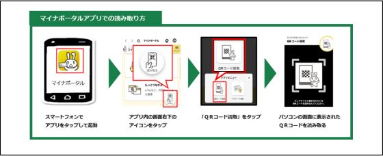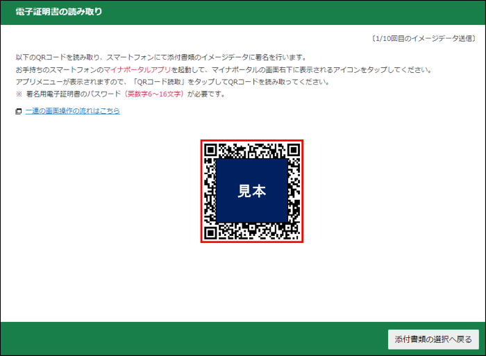 添付書類を送信前にマイナンバーカードの読み取りを求められる場合がありますので、画面に表示されたQRコードをマイナポータルアプリをインストールしたスマートフォンでQRコードを読み取ってください。