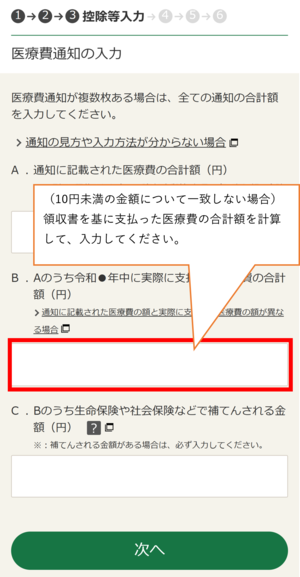 領収書等を基に実際に支払った医療費の合計額を計算していただき、「B Aのうち令和3年中に実際に支払った医療費の合計額」欄に入力してください。