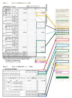 前年分の申告書第四表付表(一)と(二)を用意いただき、図の色を参考に入力してください。なお、確定申告書等作成コーナーでは山林所得に係る入力はできません。