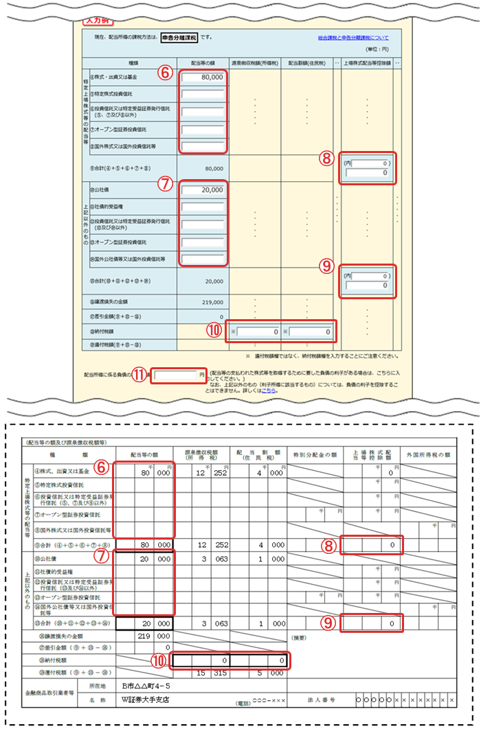 ⑥・⑦ 「配当等の額」を入力します。