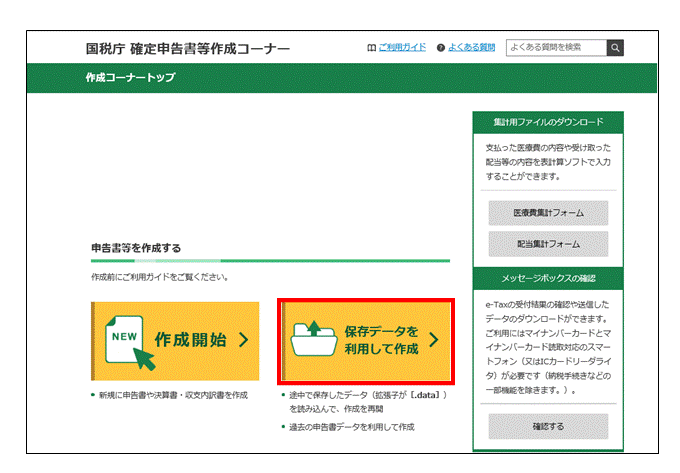 作成コーナートップ画面の「保存データを利用して作成」をクリックしてください。