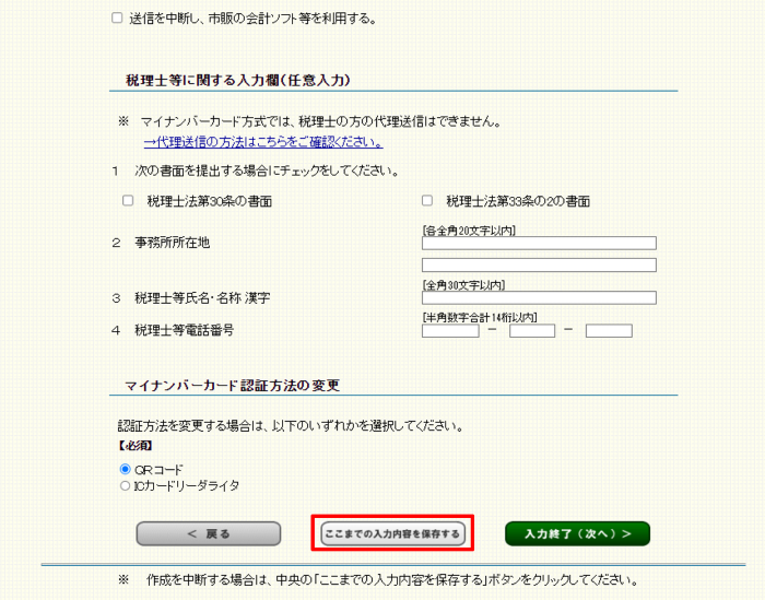 「税理士の方が代理送信を行う場合はこちら」をクリックし、進んだ先の画面で保存したデータを読み込んで作成を再開してください。