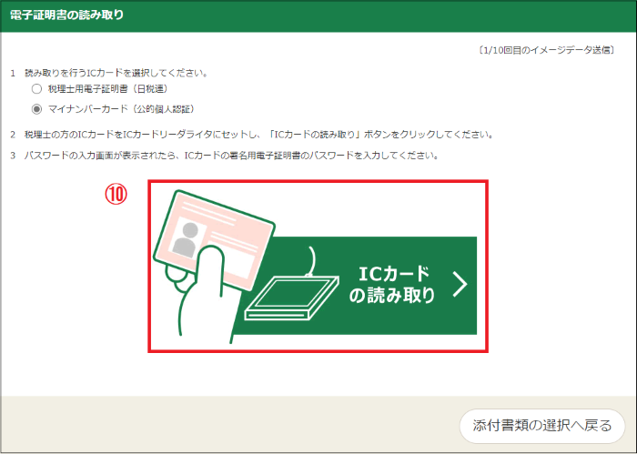 ⑩ マイナンバーカードをICカードリーダライタにセットし、「ICカードの読み取り」をクリックしてください。パスワードの入力画面が表示されますので、署名用電子証明書のパスワード(6文字以上16文字以内)を入力してください。