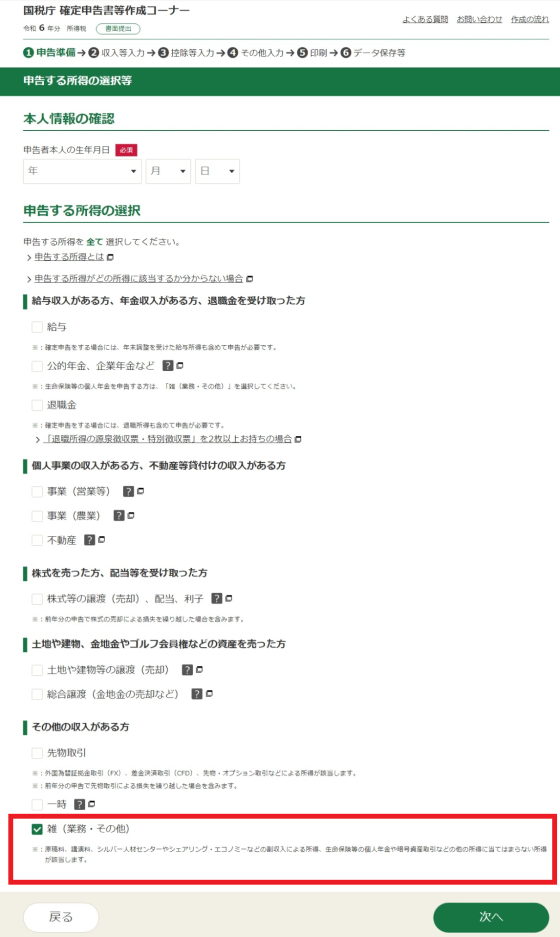 上記の所得については、「申告する所得の選択等」画面で「雑(業務・その他)」を選択し、