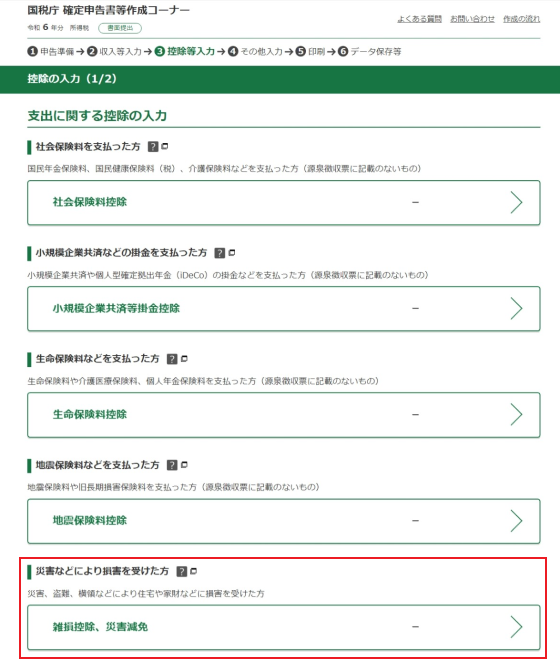 災害・盗難・横領によって住宅や家財などに損害を受けた場合は、「雑損控除」から入力してください。