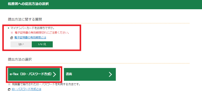 「マイナンバーカードをお持ちですか」の質問に「いいえ」を選択し、表示される「e-Tax(ID・パスワード方式)」を押してください。