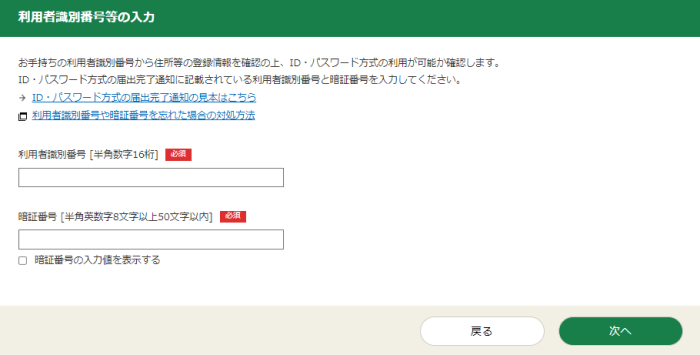 「利用者識別番号等の入力」画面が表示されるため、申告される方ご本人の利用者識別番号と暗証番号を入力して、「次へ」をクリックしてください。