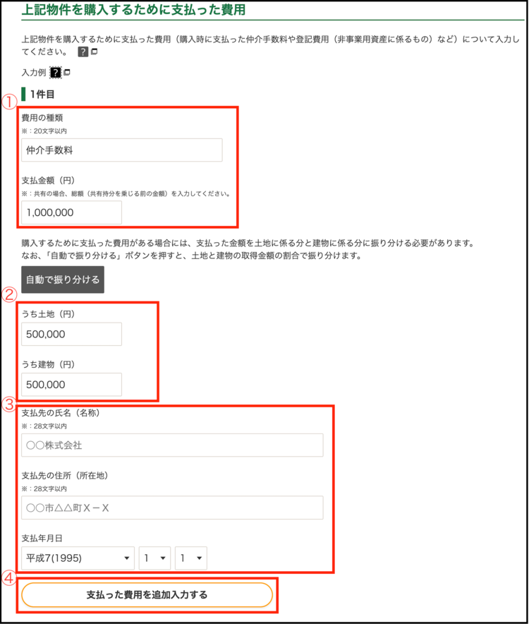 土地建物等を購入するために支払った費用(購入時に支払った仲介手数料や登記費用(非事業用資産に係るもの)など)について入力します。