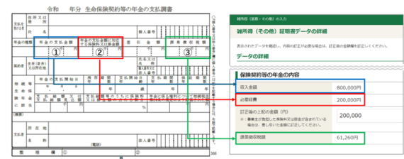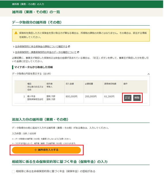実際の契約等の状況により、課税関係が異なる場合がありますので、雑所得の「収入金額」、「必要経費」、「源泉徴収税額」について、保険会社から送付された書類により、正しい金額が連携されているかご確認ください。