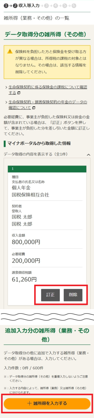 実際の契約等の状況により、課税関係が異なる場合がありますので、雑所得の「収入金額」、「必要経費」、「源泉徴収税額」について、保険会社から送付された書類により、正しい金額が連携されているかご確認ください。