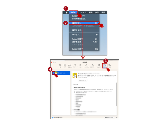 - Safariの環境設定画面で「機能拡張」をクリックします。