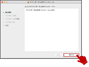 - インストール開始メッセージが表示されますので、「続ける」ボタンをクリックします。