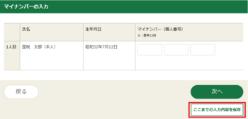 マイナンバーをお調べいただいた後で、作成コーナートップ画面の「保存データを利用して作成」から保存したデータを読み込んで作成を行ってください。