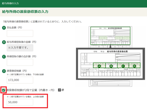 源泉徴収税額が、二段書きされていない方は、内書き部分を入力する必要はありません。
