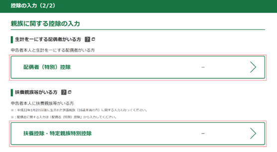 「控除の入力(2/2)」画面では源泉徴収票に基づき、配偶者(特別)控除及び扶養控除の入力が必須となっているため、各控除を開きます。