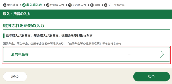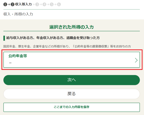 「収入・所得の入力」画面の「公的年金等」から入力してください。