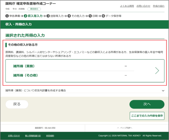 原稿料、講演料、印税、放送出演料などの収入は、事業所得に該当する場合を除き、「申告する所得の選択等」画面で「雑(業務・その他)」を選択し、