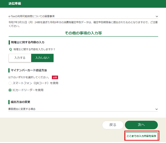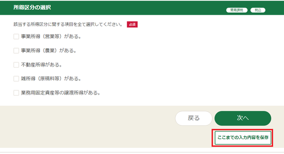 「所得区分の選択」(簡易課税制度を選択している場合は「所得区分・事業区分の選択」)画面まで進んで以降、各画面の下部に表示される「ここまでの入力内容を保存」ボタンから保存することができます。