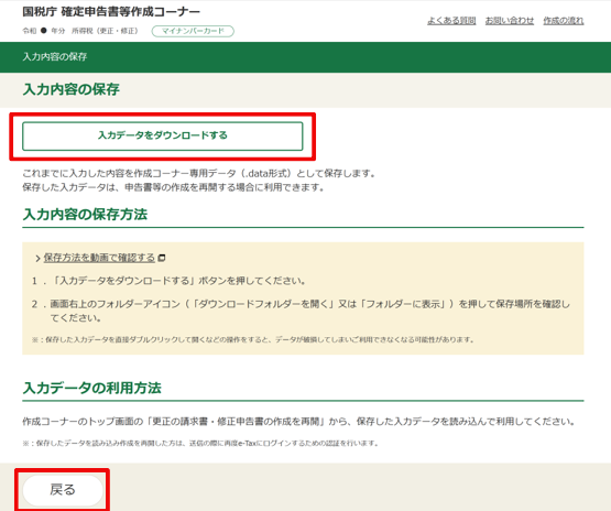 .data形式のデータを保存した後、「更正の請求書・修正申告書データの保存」画面左下の「戻る」ボタンをクリックすることで、作成途中の画面に戻ることができます。
