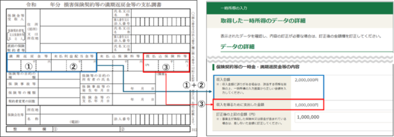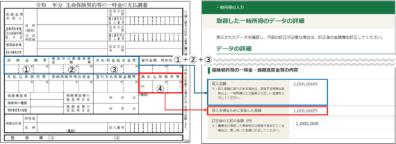 実際の契約等の状況により、課税関係が異なる場合がありますので、一時所得の「収入金額」及び「収入を得るために支出した金額」については、保険会社から送付された書類により、正しい金額が連携されているかご確認ください。