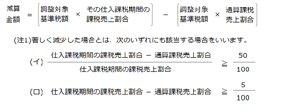通算課税売上割合が仕入課税期間の課税売上割合に対して著しく減少した場合には、次の金額(減算金額)を第3年度の課税期間の仕入控除税額から控除します。