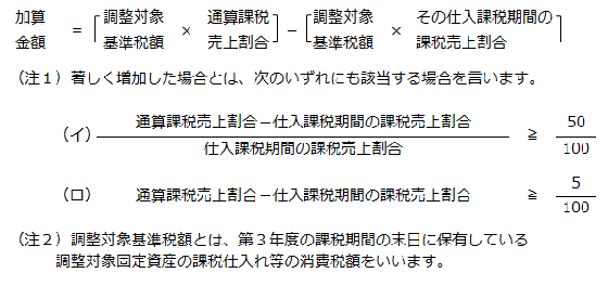 通算課税売上割合が仕入課税期間の課税売上割合に対して著しく増加した場合には、次の金額(加算金額)を第3年度の課税期間の仕入控除税額に加算します。